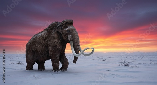 mammoth, elephant, tusk, winter, snow, sunset, sunrise, landscape, prehistoric, animal, wildlife, nature, mammal, paleozoic, ice age, extinct, history, evolution, past, ancient, artwork, illustration, colours, dramatic, red, orange, pink, purple, high-coloured, photo, image, design, background, environment, scenic, copy space, isolated, digital artwork, vector, editable, stock, photographic