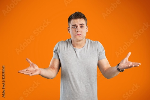 man, who, ambiguous, answer, asking, beard, careless, clueless, confused, deny, difficult, doubt, doubtful, funny, guilty, hand, hunched, indifferent, indoor, male, maybe, orange background, people, portrait
