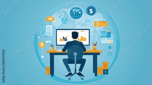 analysis, computer, chart, finance, market, investment, man, growth, datum, monitor, business, economy, technology, global, online, strategy, research, currency, trade, office, desk, work, person, job, screen, graph, financial, diagram, progress, information, network, cyberspace, earth, background, earning, profit, revenue, statistic, planning, success, management, future, digital, web, innovation, corporate, banking