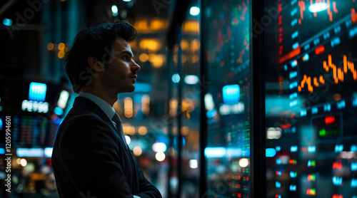 businessman, digital, stock, market, trend, business, finance, office, analysis, chart, datum, screen, city landscape, technology, economy, investment, financial, trading, modern, corporate, strategy, professional, urban, illuminated, sharpened, contemporary, wealth, risk, number, information, global, economic, setting, decision, calculation, night, pondering, serious, expertise, insight, future