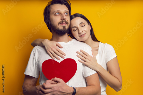 affectionate, hug, hugging, individuality, man, woman, valentine, yellow, nubes, kiss, paper, speak, listen, sensual, togetherness, giving, husband, idea, wife, girlfriend, love, young adult, flirting, lover, human relationships, t-shirt, white, facial, studio, hear, tenderness, conceptual, inspiration, proposal, heterosexual, together, engagement, human, song, smiling, smile, hand, male, romance, hold, people, dating, elegance, surprise, happiness