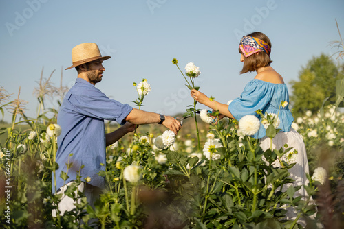 Man and a woman pick up dahlia flowers while working at rural flower farm on sunset. Concept of a small business of growing dahlias in summer garden