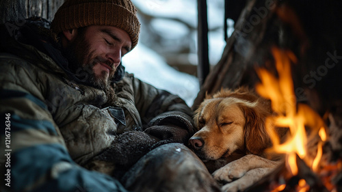 man, dog, fire, cosy, winter, camping, warmth, relaxation, nature, friendship, golden retriever, smiling, peaceful, snow, wilderness, comfort, companionship, jacket, hat, wood, log, resting, animal, pet, calmness, adventure, love, bond, serene, forest, snow-covered, hearth, snuggling, together, joy, happiness, soft, fur, expression, calm, leisure, environment, rustic, lifestyle, human