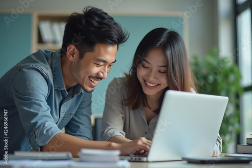 asian, man, woman, office, teamwork, collaboration, diversity, professional, business attire, workplace, meeting, discussion, computer, desk, productivity, corporate, colleague, communication, project, brainstorming, co-worker, career, leadership, innovation, laptop, couple, business, people, cyberspace, technology, smiling, home, team, businesswoman, 2, together, sitting, work, businessman, businessperson, working, lifestyle, smile, looking