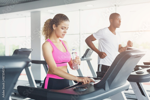 active, activity, african american, athlete, athletic, beautiful, cardio, caucasian, club, couple, diversity, effect, equipment, exercise, fit, fitness, flare, group, gym, gym, hall, happy, health, healthy, indoor, lifestyle, machine, man, person, pink, portrait, run, runner, shape, smile, sport, stationary, sunny, sympathy, training, treadmill, woman, physical exercise, young, half face, sleepy, drinking, water