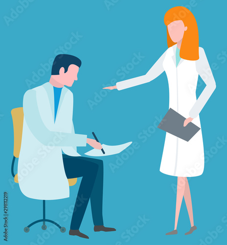 Man and woman discussing patients health, isolated doc and nurse. Doctor writing list of medication and course of treatment, lady with analysis. Vector illustration in flat cartoon style