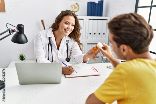 Man and woman having doctor visit prescribing pills at clinic