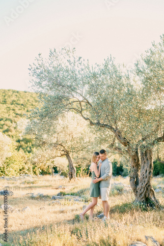 couple, man, woman, hug, standing, tree, looking, foot, 2, caucasian, boyfriend, girlfriend, sundress, shirt, dry, grass, olive, tree, grove, sunny, summer, romantic, copy space, closeup
