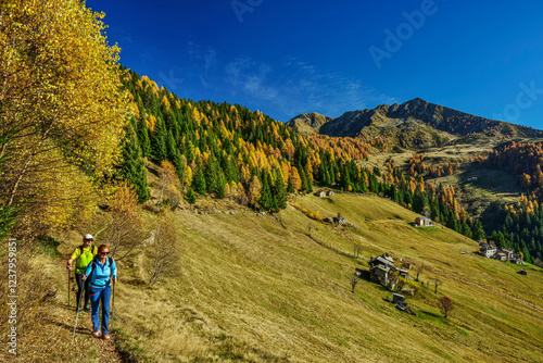 man, woman, walking, hiking, pole, mountain, blue, sky, italy, copy space, 2, people, travel, adult, journey, outdoors, nature, sunlight, light, adventure, active, lifestyle, exploration, bonding, remote, alps, range, lombardia, forest, tree, plant, autumn, season, landscape, mature, pair, grass, change, togetherness, caucasian, colours, vacation, calmness, weekend, destination, clear, scenic, explorer