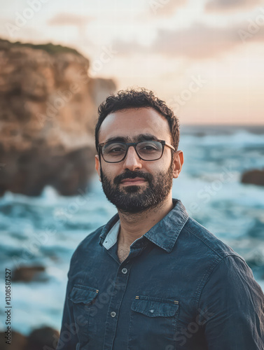 Man at the Coast: Portrait of a contemplative man with glasses and a beard standing on a rocky coast, the soft light of the setting sun illuminating the rugged terrain and the vast ocean beyond.