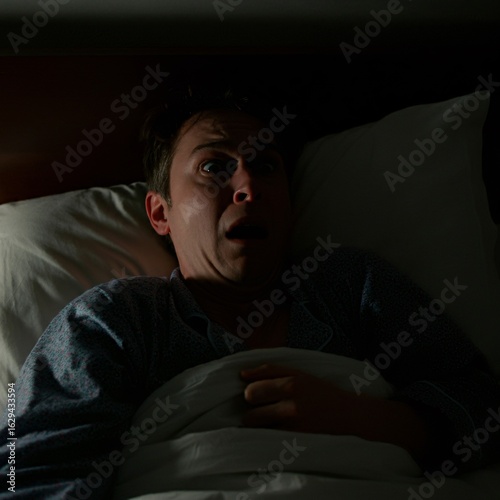 Man Awakened by a Nightmare Portrait of Fear and Shock in the Bedroom, Capture the raw emotion of a sudden awakening from a frightening dream