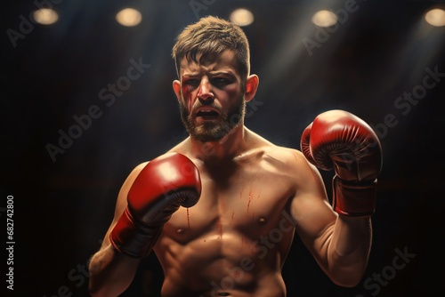Man boxer in red gloves on black background. Sports banner. Horizontal background