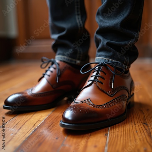 Man brown leather oxford shoes with brogue details stand on polished wooden floor. Classic dress shoes feature warm tones, detailed craftsmanship, elegant design, perfect for sophisticated lifestyle
