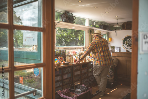 shop, man, browsing, store, retail, interior, window, hat, outdoors, daylight, commerce, client, shopping, business, lifestyle, vintage, rustic, wooden, display, good, product, item, selling, shopkeeper, buyer, looking, inside, natural light, sunlight, sunny, bright, cheerful, happy, leisure, weekend, travel, tour tourism, small business, countryside, rural, charming, quaint, discovery, exploring, buying
