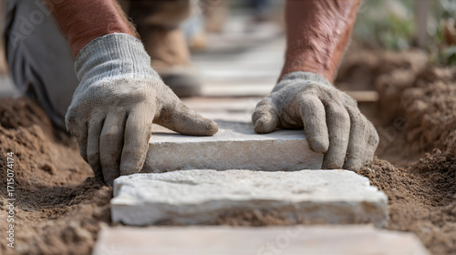 man, hand, construction, work, gloved, sand, paver, stone, pavement, builder, men at work, paving, laying, tile, home, improvement, close, detail, garden, landscaper, craft, brick, trowel, job, artisan, industry, remodel, bricolage, project, house, renovation, dirt, ground, path, walk, caucasian, healthy, sunny, professional, manual, build, new, adult, skill, tool, street