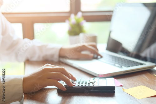 Man calculate finance business using calculator and computer laptop analysis data at morning time in modern office.
