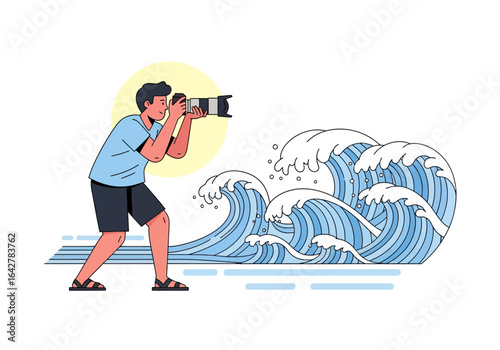 Man capturing stylized waves with camera, perfect for advertising, website banners, travel brochures, graphic design projects, and photography blogs.