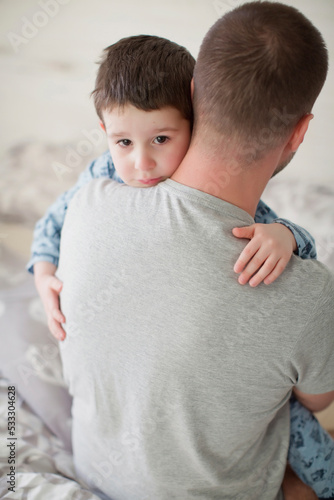 man, carrying, sad, boy, bed, home, family, 2, people, adult, children, ukraine, interior, preschool, toddler, pajama, crying, negative, emotion, sorrowful, backview, eltern, single, father, bedchamber, room, mid, pair, childhood, son, security, care, brown hair, togetherness, caucasian, lifestyle, male