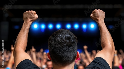 concert, crowd, cheering, man, light, stage, music, event, festival, entertainment, performance, celebration, energy, excitement, audience, live music, party, hand, arm, back, silhouette, dark background, night, atmosphere, vibe, positive, fun, joy, happiness, togetherness, passion