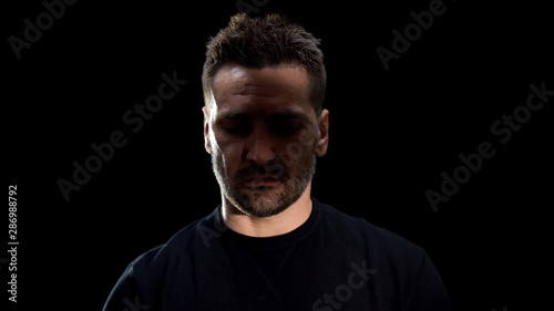 Man closed eyes in shadow black background, mental disorder, crisis depression