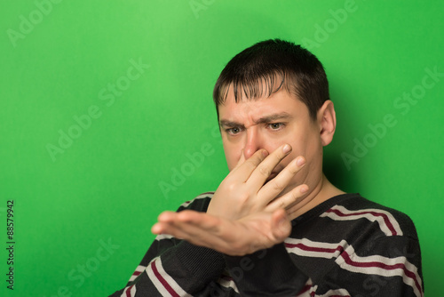 alone, bad, black, cover, cut-out, disgust, disgusting, face, fetid, finger, hair, head, nerve, nose, odour, olfaction, people, perception, person, sense, sensory, shirt, smell, stench, stink, trouble, tunisian, adult, caucasian, closed, dirty, eye, hand, human, isolated, male, man, standing, touching, white, young, man