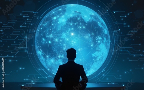 Man Contemplating Digital Future with Glowing Sphere and Data Streams. High quality