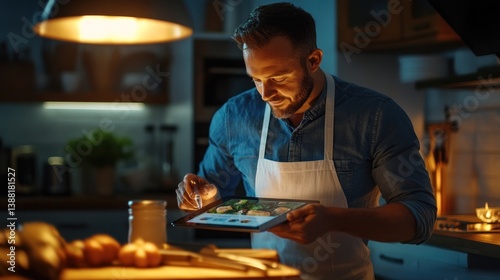 man, cooking, using, tablet, receipe, apron, kitchen, indoor, night, light, food, preparation, digital, technology, reading, home, counter, chef, male, adult, culinary, skill, learning, online, dinner, lifestyle, warm, dark, bearded, casual attire, enjoying, looking, studying, domestic, device, cyberspace, content, electronic, display