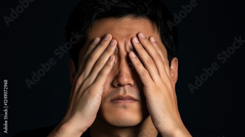 man, face, hand, covering, distress, sorrowful, depression, anxiety, mental health, stress, frustration, grief, pain, emotion, dark, shadow, closeup, portrait, head, eye, nose, mouth, finger, skin, serious, despair