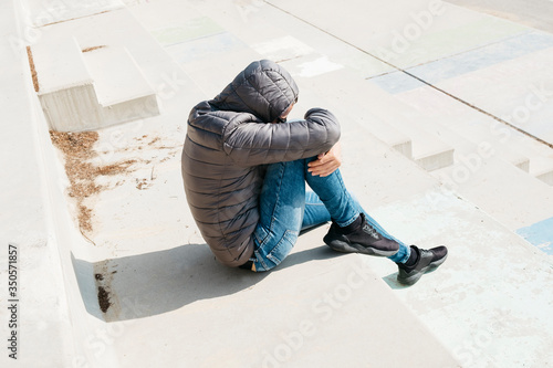 man, unhappy, upset, annoyed, annoyance, person, anxious, anxiety, desperate, desperation, sorrowful, pain, grieved, struggle, trouble, problem, helpless, hopeless, worry, worried, preoccupation, preoccupied, depressed, depression, grief, heartache, breakup, crisis, dismissed, dismissal, loss, loser, ruination, bleacher, stand, unemployed, bullying, mobbing, harassment, suffering, fear, mental, disorder, loneliness, alone, lonely, isolation, urban, city, horizontal