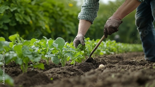 Man digging soil land with mtor cultivator making garden beds for spring planting of potatoes Good harvest Family farming self cultivation of healthy natural eco friendly bio foodveget : Generative AI