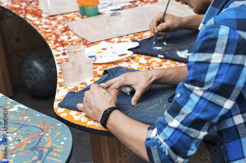 man draws on a T-shirt