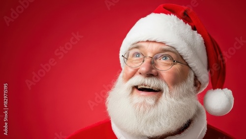 Man dressed as Santa Claus, with a long white beard and glasses, looking up and smiling. Holiday season marketing and Christmas greeting card concept.