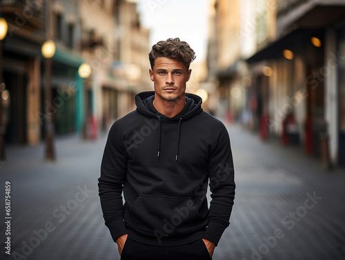 black, textile, clothing, cotton, clothes, jumper, apparel, man, hoodie, sport, sweatshirt, mock, empty, blank, male, template, european, wearing, standing, brand, man, model, street, guy, wear, shirt, young, urban, space, hood, fabric, lifestyle, jacket, clothes, hooded, city, fashion, portrait, tattoo