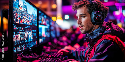 Man Engaging in Esports Broadcasting Wearing Headset in Front of Multiple Monitors in a Vibrant Setting