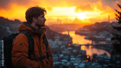 sunset, man, city, view, landscape, winter, travel, backpack, sunrise, horizon, adventure, nature, cold, exploration, journey, person, silhouette, sky, cloud, mountain, hill, river, building, urban, light, gold, orange, red, yellow, beautiful, scenic, amazing, calm, peaceful, serene, relaxing, contemplative, solitude, freedom, hope, inspiration