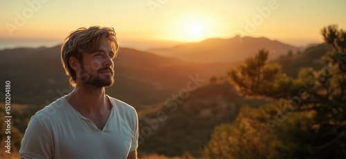 Man enjoying sunset view in mountains with serene expression and golden light