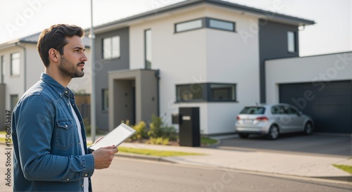 man, tablet, real estate, residential area, technology, looking, new home, male, casual attire, suburban, architecture, investment, realtor, landscape, urban living, professional, planning, new construction, lifestyle, homeownership, decision