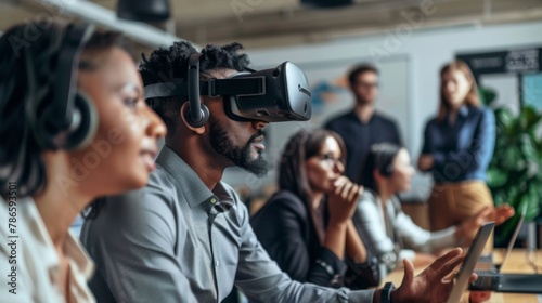 ai, headset, technology, man, office, co-worker, seated, digital, exploration, modern, group, interactive, tech, life events, business, professional, equipment, innovation, contraption, user, male, teamwork, colleague, indoor, corporate, adult, presentation, meeting, multimedia, device, simulation, contemporary, software, engagement, interface, demonstration, futuristic, people