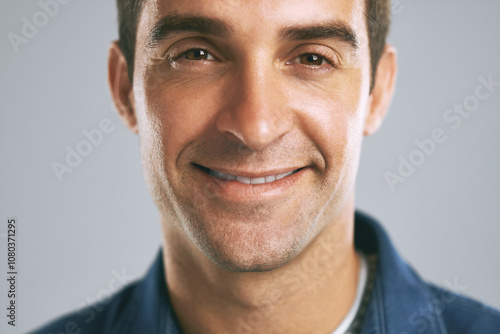 Man, face and happy in studio for positive attitude, confidence and pride with gray background. Male person, portrait and employee for creative agency, design and career growth with smile in Madrid