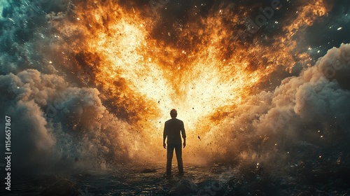 Man Facing Fiery Explosion: A Dramatic Surreal Scene