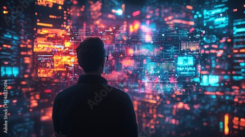 man, city, digital, technology, night, background, colourful, light, high-coloured, abstract, future, urban, scene, silhouette, exploration, innovation, datum, visualisation, connection, perspective, atmosphere, modern, design, cyber, electronic, display, view, beauty, network, vibrant, information, skyline, digitization, imagination, motion, creativity, surreal, metropolis, dynamic, life events, tech, aesthetic, landscape, virtual, blend, high technology