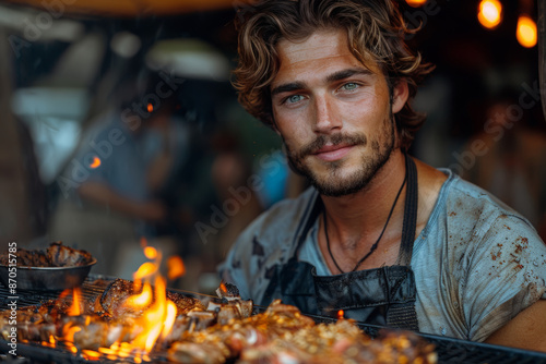 man, grilling, meat, fire, flames, bar-b-q, cook, chef, food, cooking, grill, bar-b-q, smoke, heat, preparing, dinner, steak, rib, chicken, pork meat, vegetable, charcoal, hot, tasty, delicious, ravenous, summer, party, gathering, friends, family, backyard, picnic, camping, adventure, enjoying, relaxing, casual attire, fun, lifestyle, male, portrait, close, face, eye, beard, hair