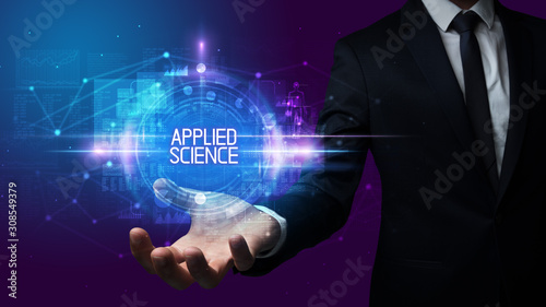 Man hand holding APPLIED SCIENCE inscription, technology concept