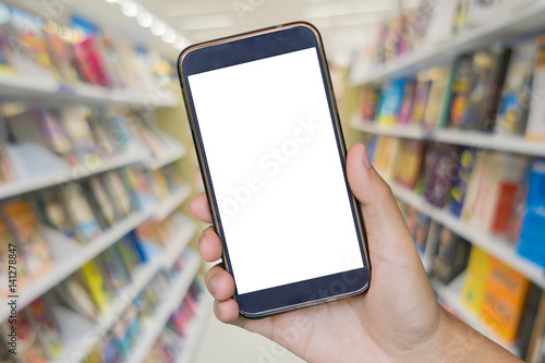 Man hand holding mobile smart phone , tablet,cellphone over Blur Shop Background in Book store Shelf Natural bokeh out of focus Bookstore,Blur background of people in library,book store.vintage photo