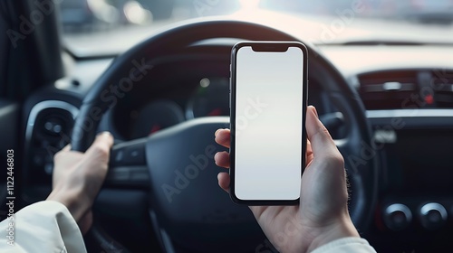 Man hand holding smartphone with blank screen while driving car