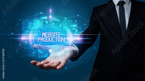 Man hand holding WEBSITE PRODUCTION inscription, technology concept