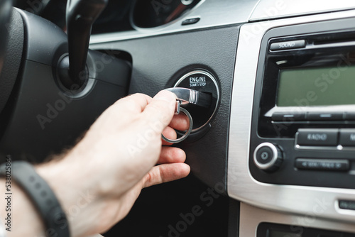 Man Hand Insert Key into the Lock of Ignition of car. Car ignition key