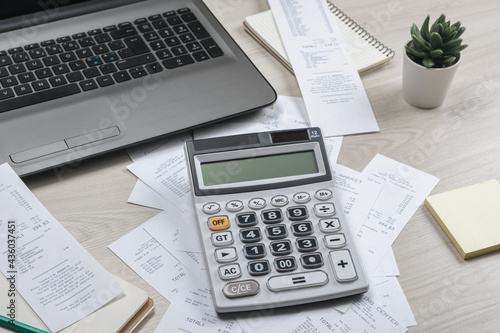 Man hand using calculator and writing make note with calculate about cost and taxes at home office. Businessman doing some paperwork in the workplace