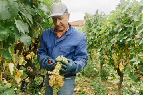 man, harvest, grape, vinery, occupation, men at work, overall, scissors, work, hold, cutting, racked, ripe, job, life events, grape, wine, outdoors, day, looking down, vine-growing, winegrower, grape harvest, business, workwear, expertise, baseball cap, grapevine, vine, rural, pruning shears, nature, seasonal, mature, people, alone, 1, caucasian, spain, galicia, agriculture, food, drink, fruit