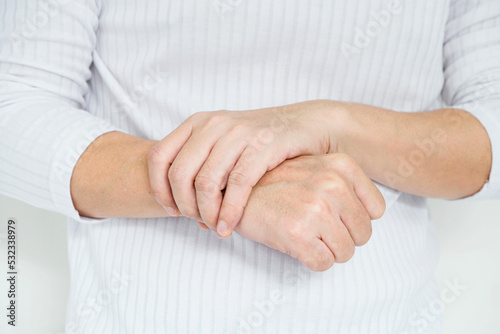 Man, he relieves the pain in the wrist. by squeezing the wrist massage He suffered a tendon injury and arthritis in his wrist from office syndrome.